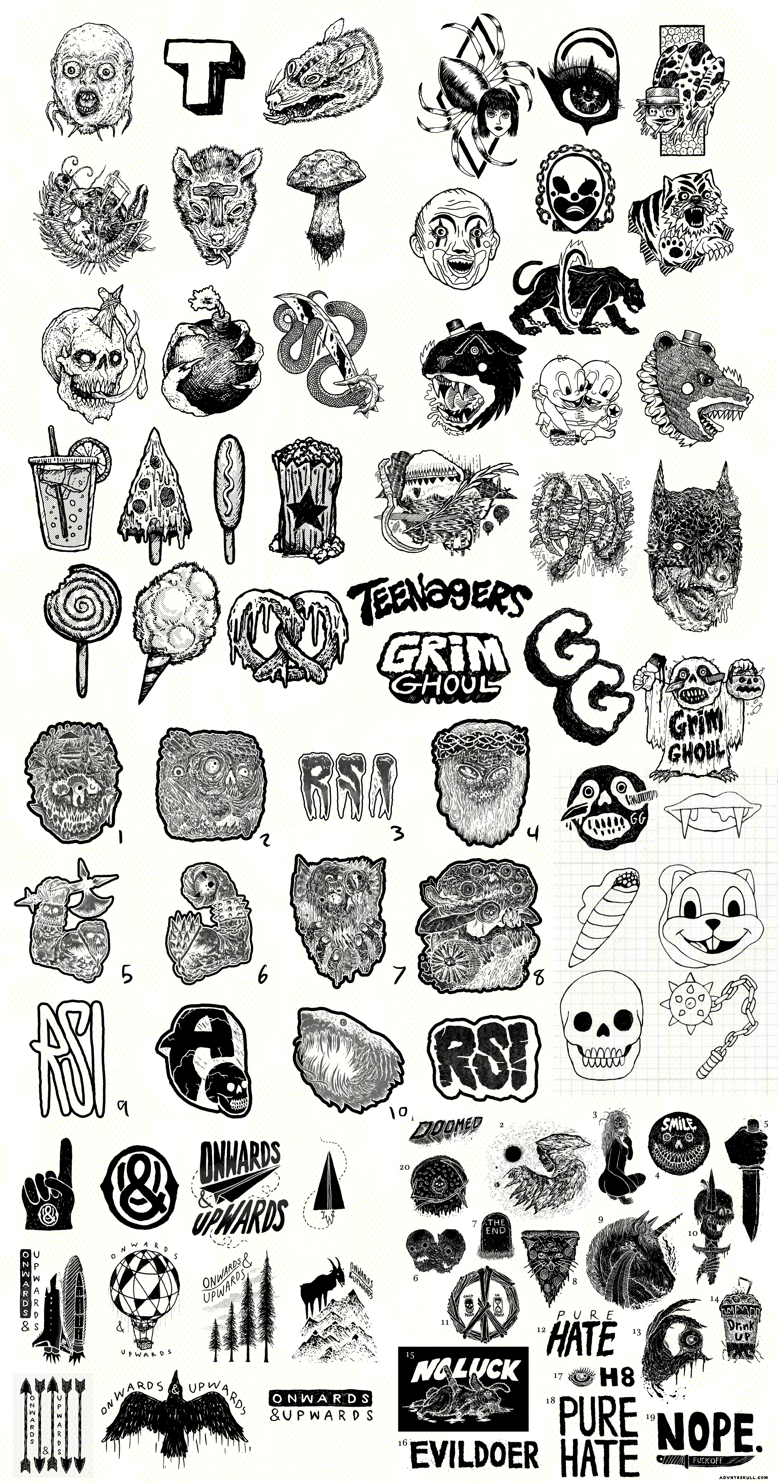 In the most simplistic terms, I charge $200 USD for FIVE designs total. You provide me with a brief of your company/band/project and I translate them into vectored, single-color artwork. For example, if you were to say your band is really into rats, eyeballs, cupcakes, rollerblades, and sewer mutants, I would take that brief and create 5 unique designs and send them over print ready in a 15x20, .PSD file at 300 DPI. Why so cheap for 5 designs you might ask? This is where the catch comes in: I sketch, ink, finish and finalize the designs without any feedback or revisions as I go. By eliminating this process, I am able to make art I think is awesome and do it quickly.